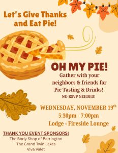 « All Events This event has passed. Oh My Pie! November 19, 2025 @ 5:30 pm - 7:00 pm « Social and Sports Commission Community Affairs Commission » Add to calendar Google Calendar iCalendar Outlook 365 Outlook Live Details Date: November 19, 2025 Time: 5:30 pm - 7:00 pm Event Categories: Featured, Special Event